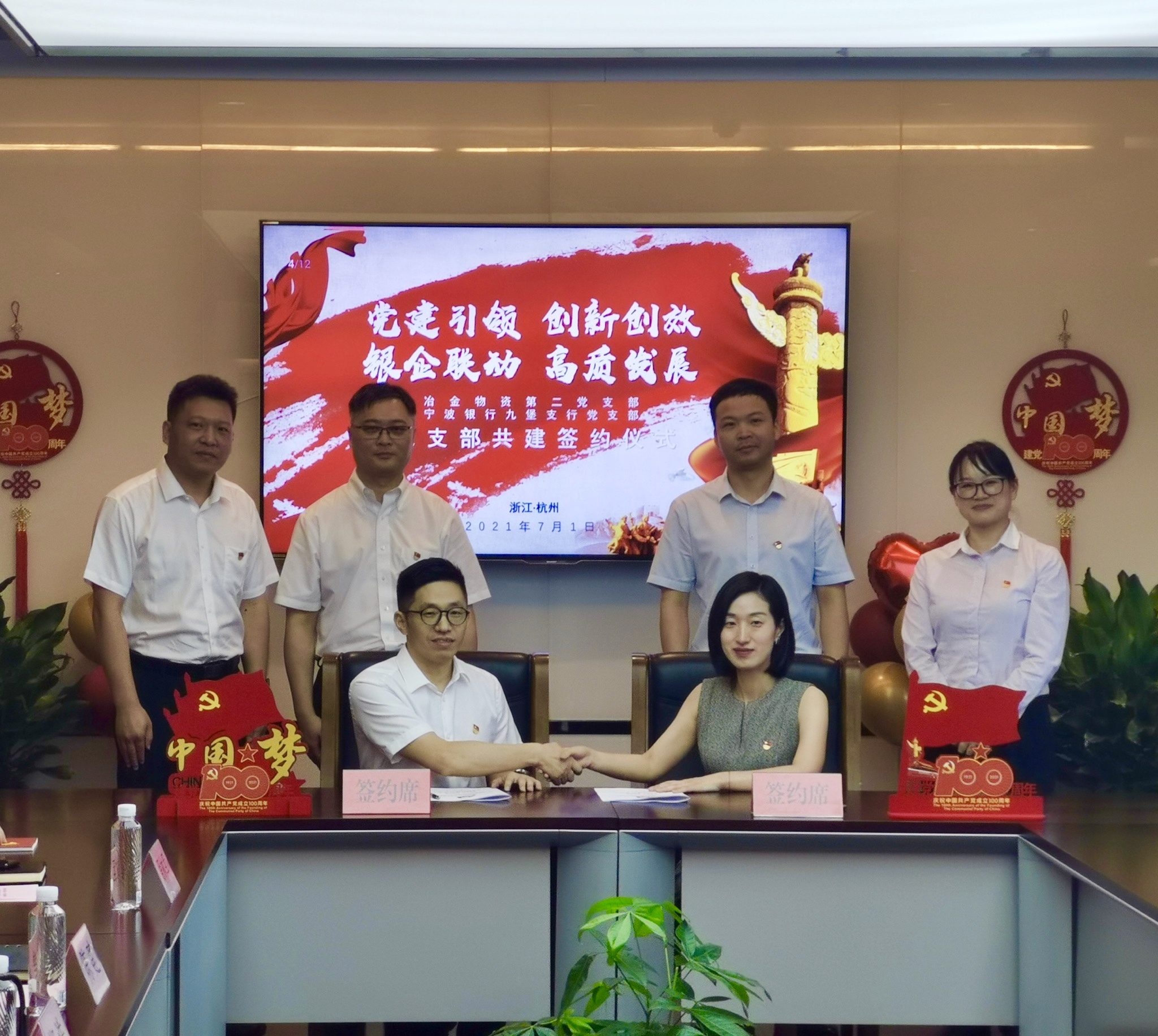 7月1日上午,浙江省冶金物資有限公司與寧波銀行杭州九堡支行共同組織集中開展主題黨日活動(dòng),收看“慶祝中國共產(chǎn)黨成立100周年大會(huì)”慶典盛況,學(xué)習(xí)習(xí)近平總書記發(fā)表的重要講話,共慶黨的百年華誕。會(huì)上,雙方黨員在冶金物資黨委書記、董事長、總經(jīng)理鄭浩的帶領(lǐng)下重溫入黨誓詞,冶金物資第二黨支部和寧波銀行杭州九堡支行黨支部舉行了支部共建簽約儀式。